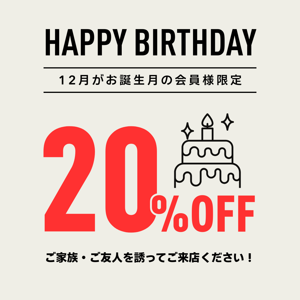 ★店内ほぼ全品20%OFF★12月がお誕生月の会員様限定!ハッピーバースデー特典のお知らせ♪