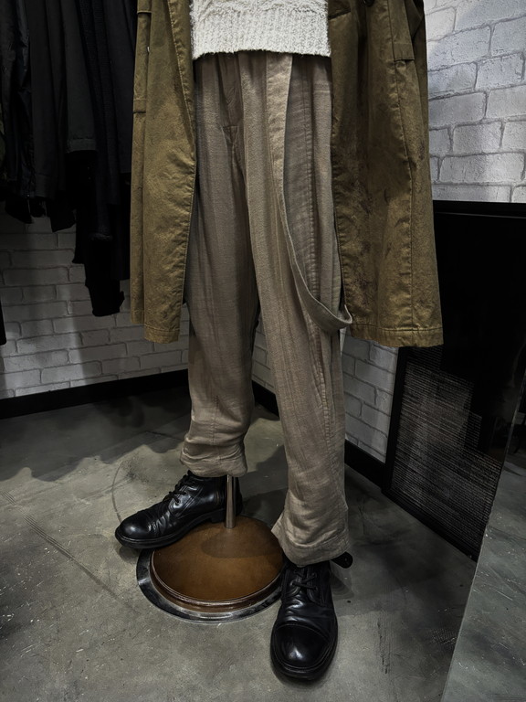 ウエストから垂れたサスペンダーベルトがブーツのボリュームと相性が良く、コートを脱いだときや歩いた時に見えるのもこのパンツのいい所です。マネキンで再現は出来ませんでしたが、ブーツインするスタイルでも腰回りのボリュームある分、バランスが良く見えます。