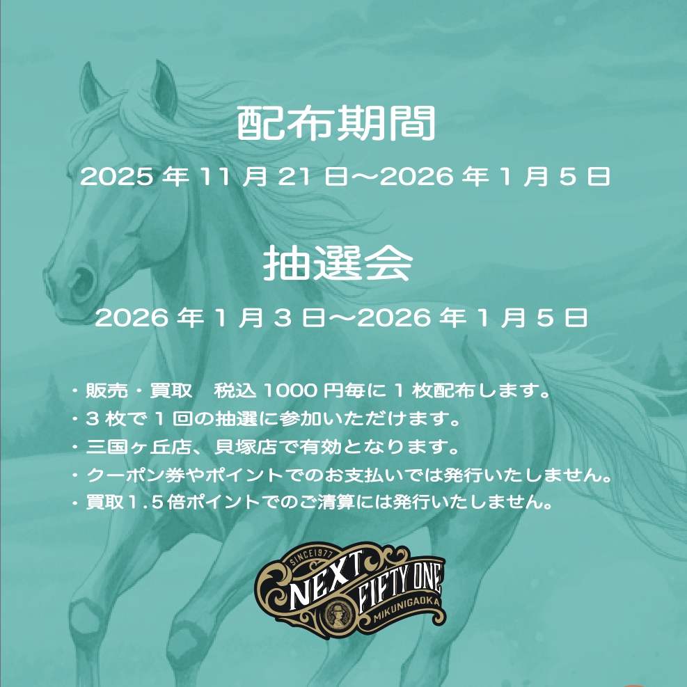 販売と買取ともに、お会計1,000円ごとに抽選券1枚を配布いたします。ガラガラ抽選は「抽選券3枚につき1回」参加可能です。