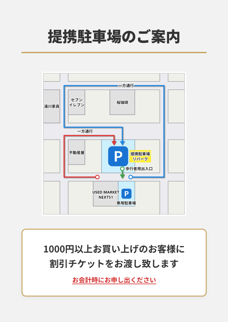 提携パーキングをご利用の際は、お会計時に 駐車券をスタッフまでご提示 お願いいたします。